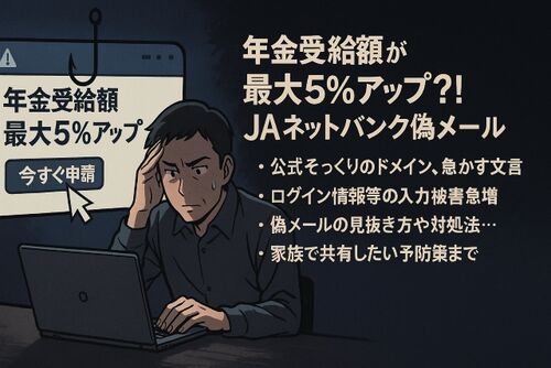 突然届いた「年金受給額が最大5%アップ」という甘い誘い──実は JAネットバンクを騙るフィッシング詐欺かもしれません。公式そっくりのドメインや《今すぐ申請》と急かす文言に惑わされ、ログイン情報やワンタイムパスワードを入力してしまう被害が急増中で…
