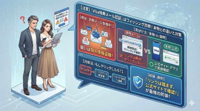 最近、「Visaの特典メール認証のお知らせ」という件名のメールを受け取ったという声が増えています。