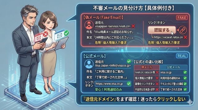 表示上は「visa-japan.verify」など公式風でも、リンク先が不審なドメインに飛ぶケースが多いです。
